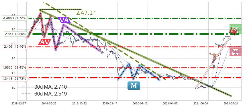 ♘ 阻力价格位3.385,可信任强度59.16%,距离最后交易2021-09-24形成的收盘价格2.780相差 +21.78%