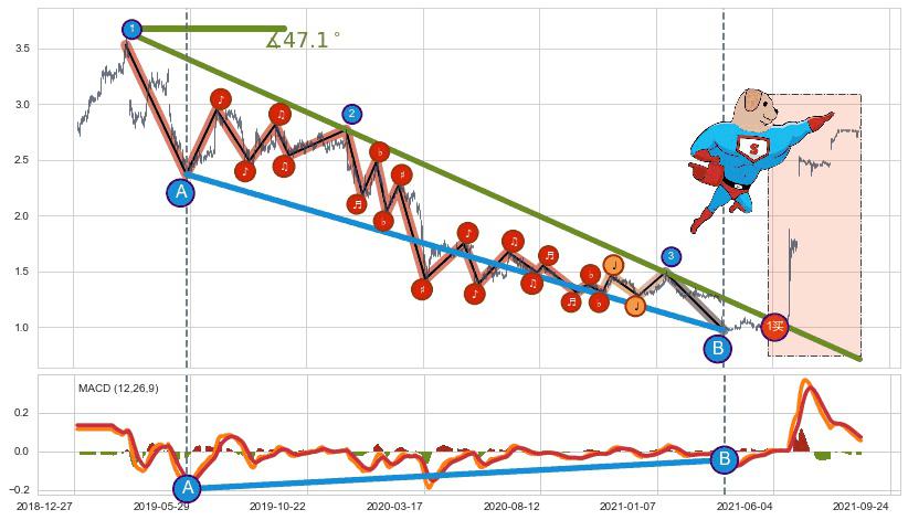 ➣ 【MACD】下跌趋势出现【常规背离 & 反转信号】背离程度34.35%,背离夹角角度55.2˚,背离程度较大