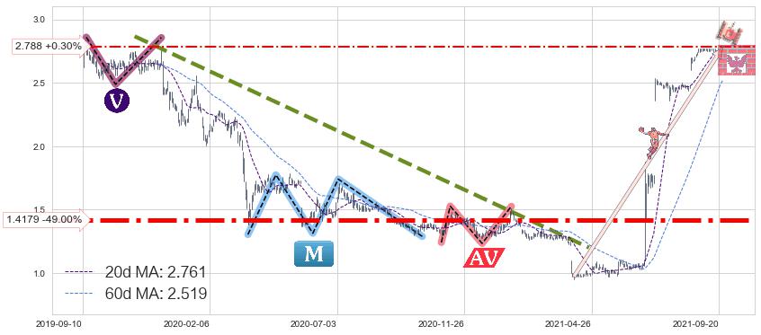 ♘ 支撑价格位2.788,可信任强度53.86%,距离最后交易2021-09-24形成的收盘价格2.780相差 +0.30%