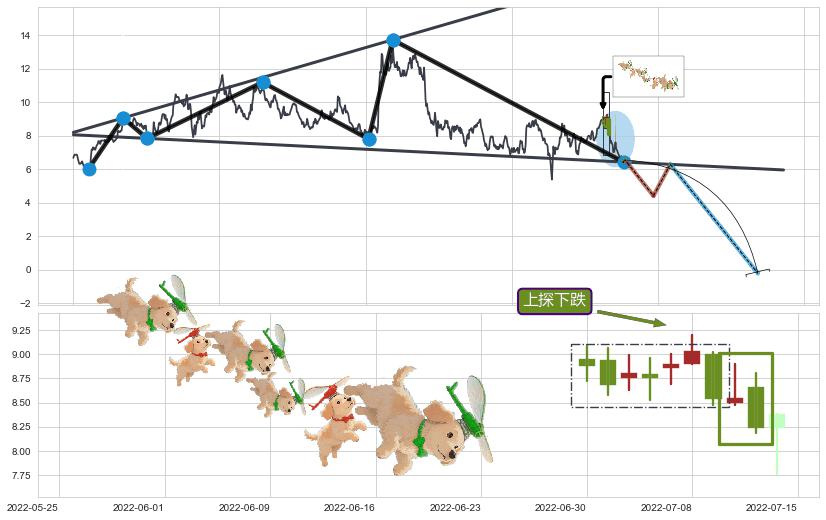 | 8 🅚:下跌身怀六甲 ➕ 📐:扩散三角反转猜想突破点临近,临近关键支撑位,预期下沉突破下跌 ☞ 看空信号 ⇥ 【🅚线】交织【图形】⇥ 综合量化分数: 41 | > |