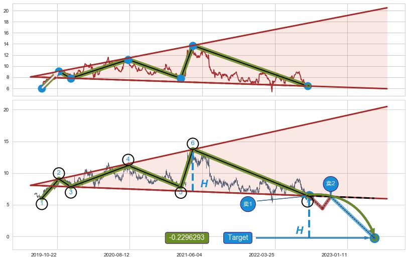➢ 最小反转跌幅→𝐇: 6.62 (逐步抬高阻力斜边最后的阻力点⑥与支撑边垂直距离)