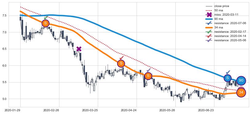 下跌趋势2020-01-29-2020-07-13,均线90, 34确认关键阻力4处
