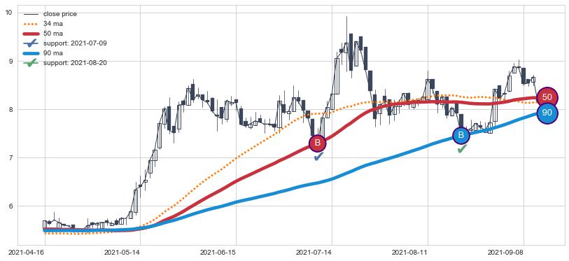 上涨趋势2021-04-16-2021-09-13,均线50, 90确认关键支撑2处