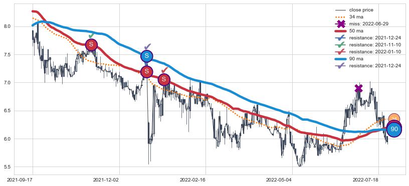 下跌趋势2021-09-17-2022-07-25,均线50, 90确认关键阻力3处
