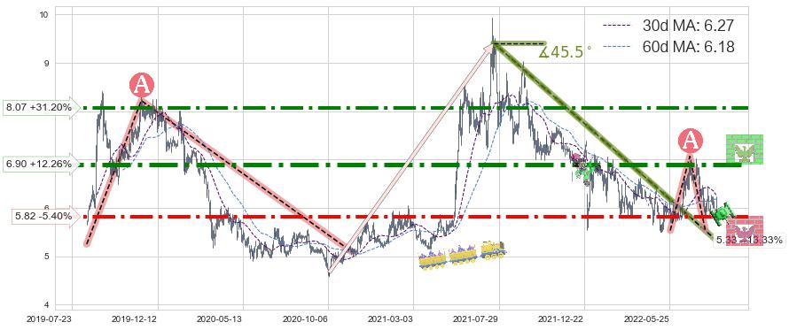 ➣ 2021-07-21-2022-06-28下跌趋势存在反转上涨[机会],其原下跌趋势的阻力位(5.33)已被突破[强支撑信号],原下跌趋势角度: 45.5˚