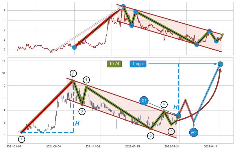 ➢ 最小中继整理跌幅→𝐇: 2.213 (低点逐步抬高斜边第一支撑点②与阻力边垂直距离)