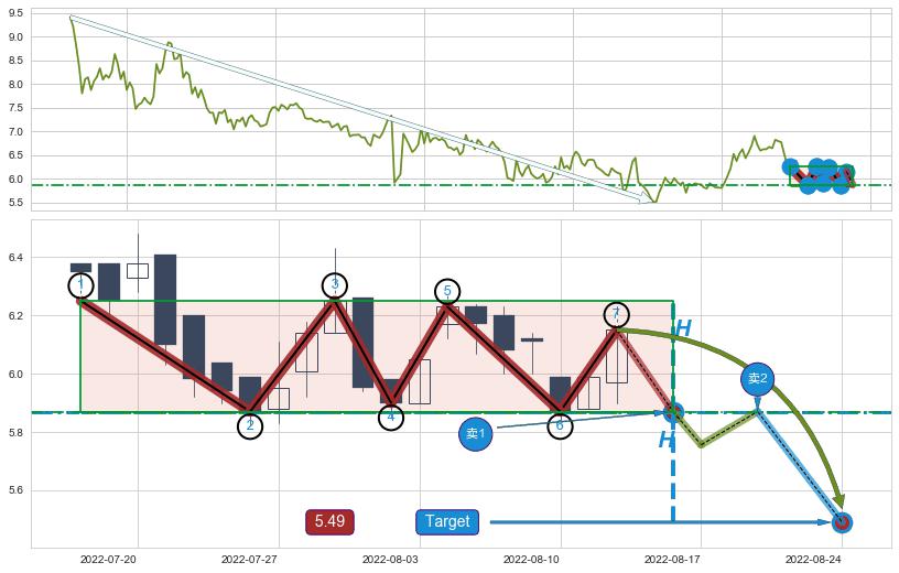➣ 【未确认突破,预测即将形成突破】下跌矩形整理起点:2022-06-29, 预测突破点:2022-08-16,形态共34交易日