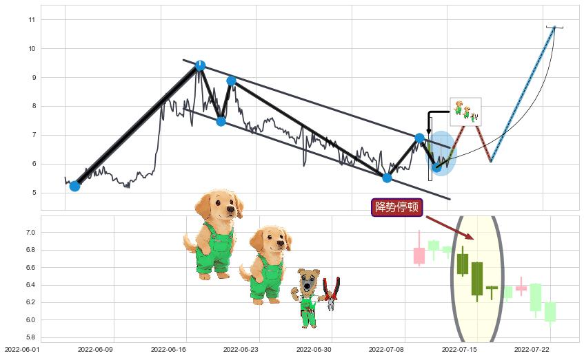 ➣ 低点影线(2022-04-22: 6.02 )→回踩→第一根k线高点(2022-04-13: 6.09 )