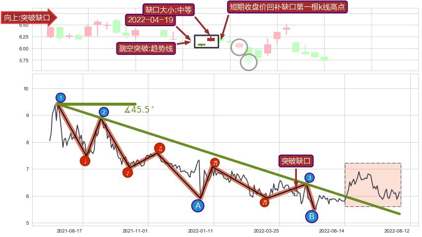 从2021-07-21至2022-06-28,共包含230个交易日,阶段股价下跌-24.14%,阶段股价变动位移路程比: 1 : 19,下跌趋势角度: 45.5,2021-12-28向↘︎形成缺口,跳空下跌-19.37%˚