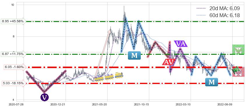 ♘ 阻力价格位6.87,可信任强度57.61%,距离最后交易2022-08-12形成的收盘价格6.15相差 +11.75%