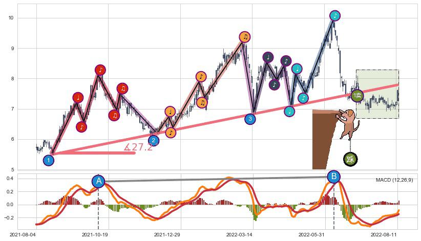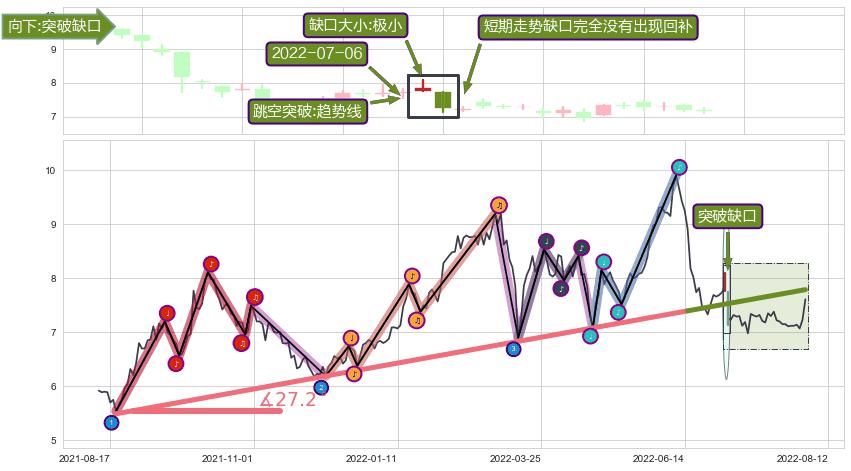 ➣ 2021-08-19-2022-06-15上升趋势存在反转[风险],虽然原上升趋势的支撑位(7.79)已破位,但其支撑效果尚存,原上升趋势角度: 27.2˚