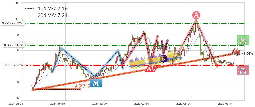 ♘ 阻力价格位8.33,可信任强度69.01%,距离最后交易2022-08-12形成的收盘价格7.61相差 +9.46%