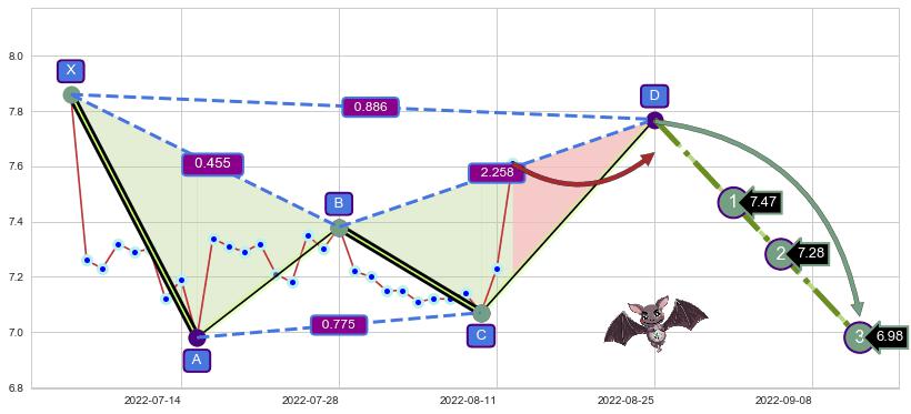 ➣ 未完成【蝙蝠】形态起点X: 2022-07-05, 已到达C点: 2022-08-10, 预测最终D点: 2022-08-25, 共38交易日