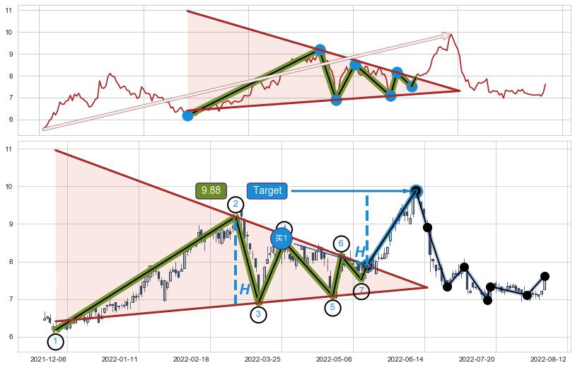 ➢ 【买1】: 激进型 买点 →(2022-05-16: 7.90 )形成突破上升【对称】三角形整理【整理】形态