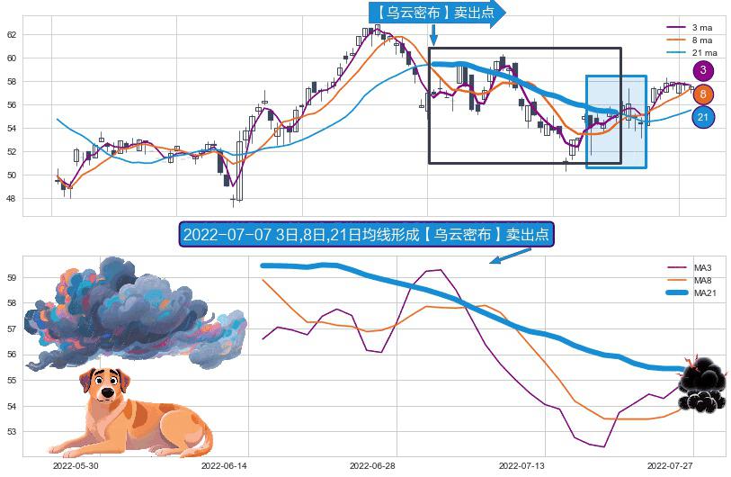⚀ 2022-06-15日-2022-07-27日显现 3日-8日-21日均线 【乌云密布】卖出点 看空信号,后市看跌,卖出