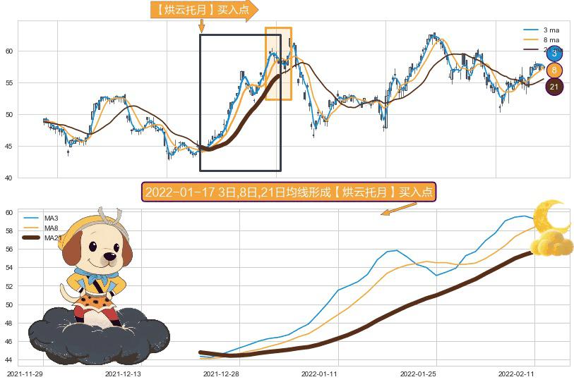 ⚀ 2021-12-21日-2022-02-14日显现 3日-8日-21日均线 【烘云托月】买入点 看多信号,后市看涨,买入