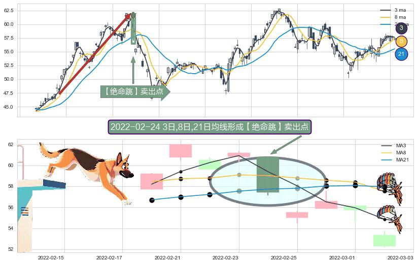 ⚀ 2022-02-24日显现 3日-8日-21日均线 【绝命跳】卖出点 看空信号,后市看跌,卖出