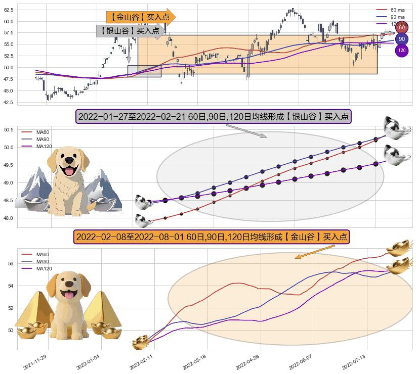 ⚀ 2022-02-09-日至2022-08-01-日显现 60日-90日-120日均线 【金山谷】买入点 其再次确认了买入信号,可靠性更强,买入