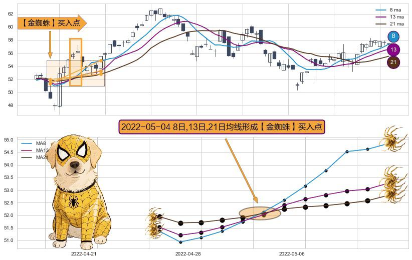 ⚀ 2022-05-04日显现 8日-13日-21日均线 【金蜘蛛】买入点 看多信号,后市看涨,买入