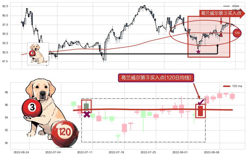 ⚀ 2022-08-03-日显现 葛兰威尔均线 120日均线 第③买入点 上升趋势的中继信号,后市看涨,买进信号