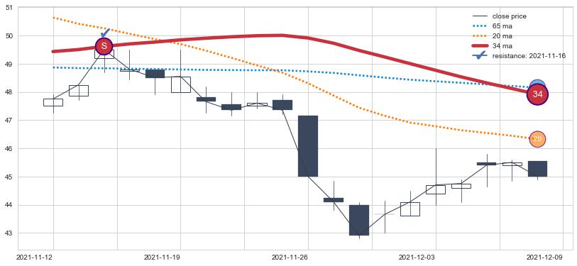⚁ MA3和MA8走势平行,且始终保持在短距离内,MA21始终在短中期均线上方,与短中期均线保持一定的距离,微微下行