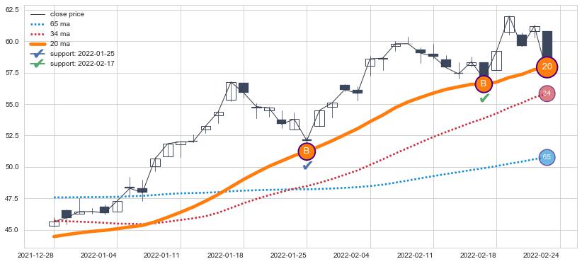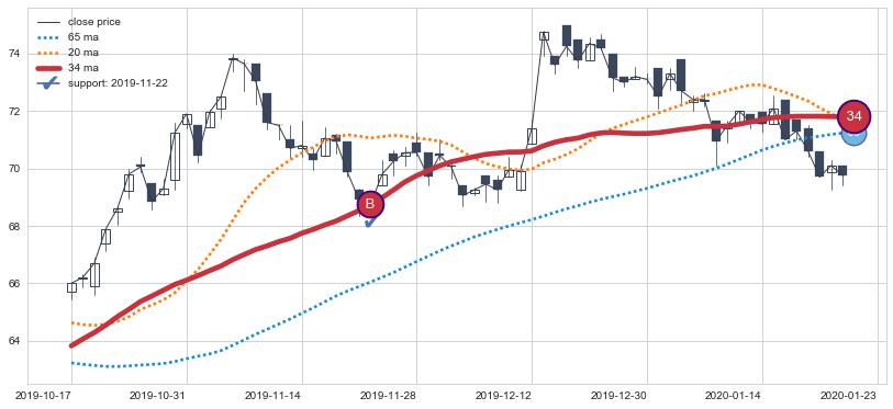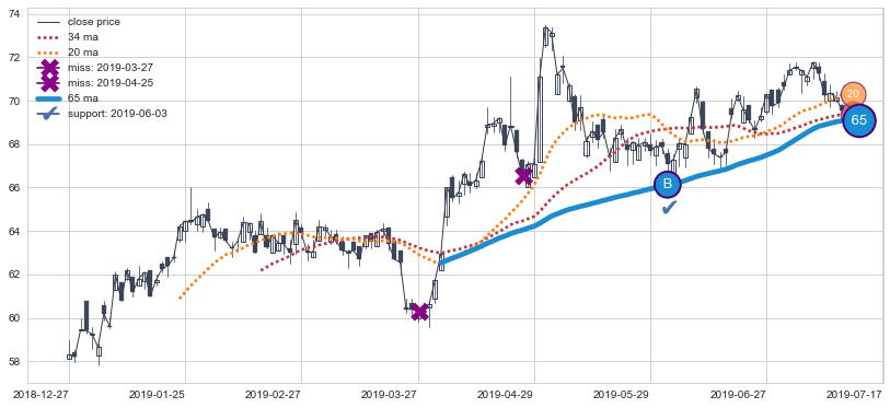 ⚁ MA3和MA8走势平行,且始终保持在短距离内,MA21始终在短中期均线下方,与短中期均线保持一定的距离,微微上行