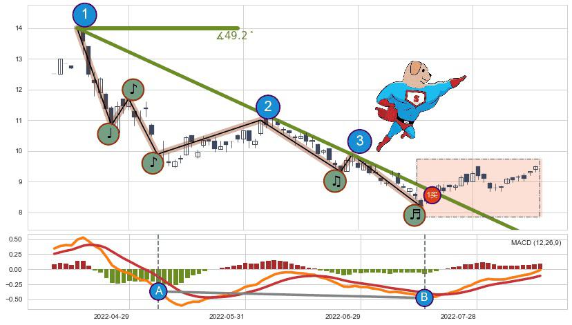 从2022-04-13至2022-08-11,共包含80个交易日,阶段股价下跌-36.62%,阶段股价变动位移路程比: 1 : 5,下跌趋势角度: 49.2