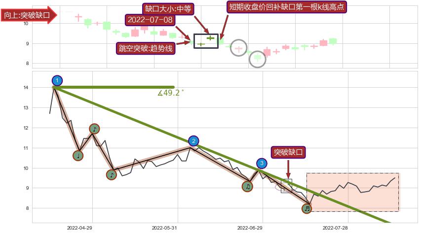 ➣ 收盘价(2022-07-13: 8.77 )→回踩→第一根k线高点(2022-07-07: 9.00 )