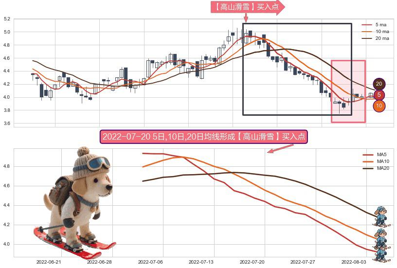 ⚀ 2022-07-04日-2022-08-04日显现 5日-10日-20日均线 【高山滑雪】买入点 看多信号,后市看涨,买入