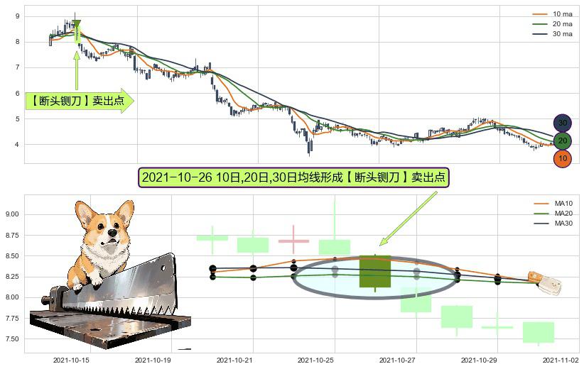 ⚀ 2021-10-26日显现 10日-20日-30日均线 【断头铡刀】卖出点 看空信号,后市看跌,卖出