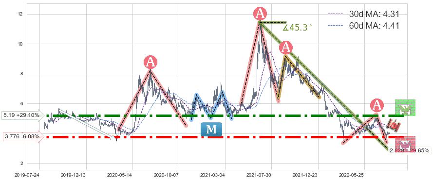 ♘ 阻力价格位5.19,可信任强度87.41%,距离最后交易2022-08-12形成的收盘价格4.02相差 +29.10%