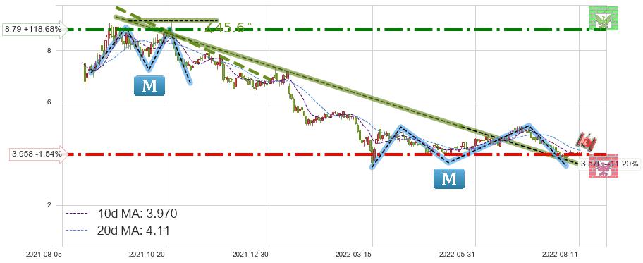 ♘ 阻力价格位8.79,可信任强度75.76%,距离最后交易2022-08-12形成的收盘价格4.02相差 +118.68%
