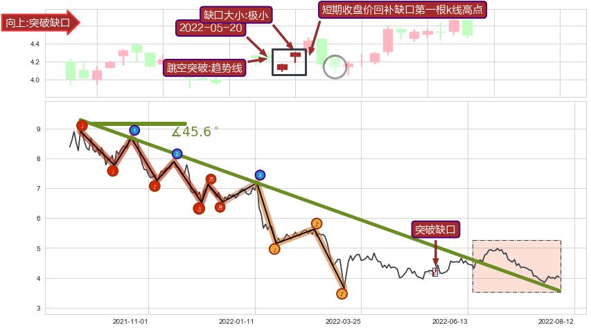 ➣ 2021-09-10-2022-05-20下跌趋势存在反转上涨[机会],虽然原下跌趋势的阻力位(3.570)已被突破,但其阻力效果尚存,原下跌趋势角度: 45.6˚