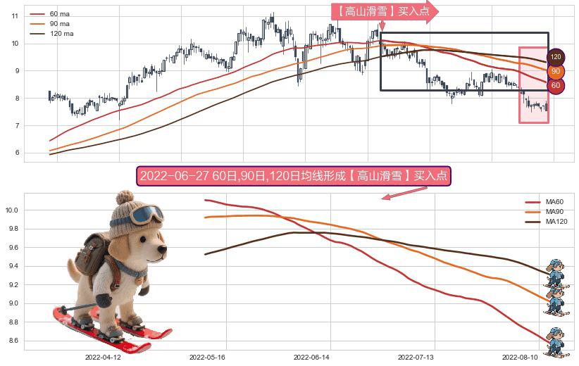 ⚀ 2022-05-10日-2022-08-12日显现 60日-90日-120日均线 【高山滑雪】买入点 看多信号,后市看涨,买入