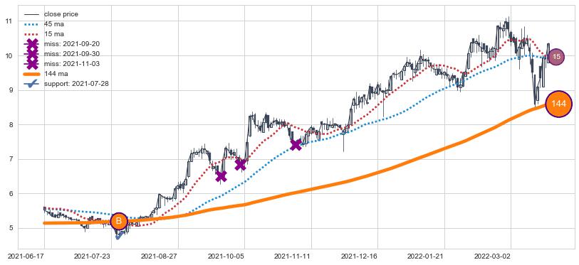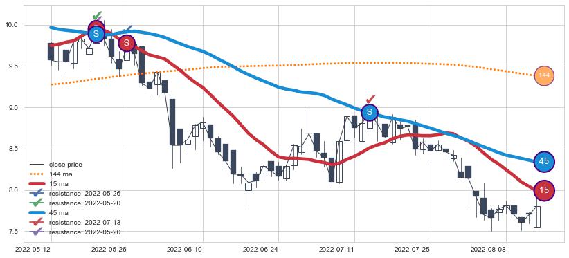 ⚄ 价格在均线遇到阻力后已再次向下回落了【较长】距离, 第⑦卖出点 阻力效果得到【初步确认】