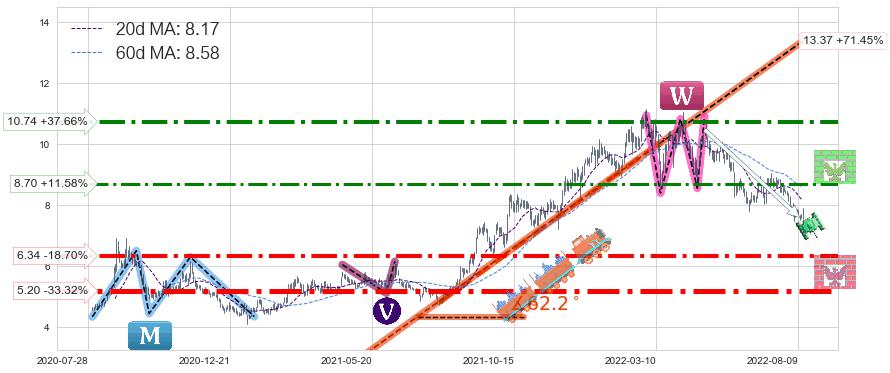 ♘ 阻力价格位10.74,可信任强度77.63%,距离最后交易2022-08-12形成的收盘价格7.80相差 +37.66%