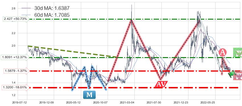 ♘ 阻力价格位2.427,可信任强度59.73%,距离最后交易2022-08-12形成的收盘价格1.6100相差 +50.73%