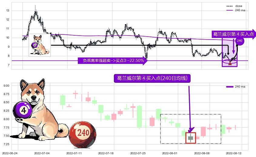 形态多维评估: ⚀ 2022-08-03-日显现 葛兰威尔均线 240日均线 第④买入点 下降趋势均值回复的短线反弹信号,后市看涨,买进信号