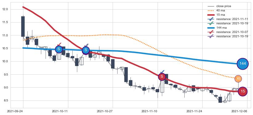 下跌趋势2021-09-24-2021-12-06,均线144, 15确认关键阻力3处