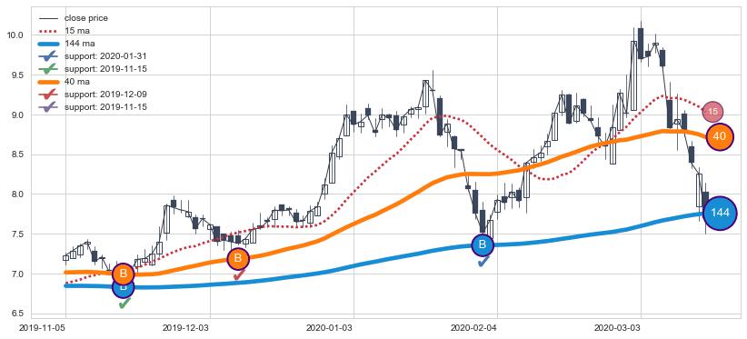上涨趋势2019-11-05-2020-03-16,均线144, 40确认关键支撑3处