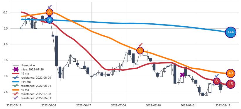 下跌趋势2022-05-19-2022-08-12,均线144, 40, 15确认关键阻力3处