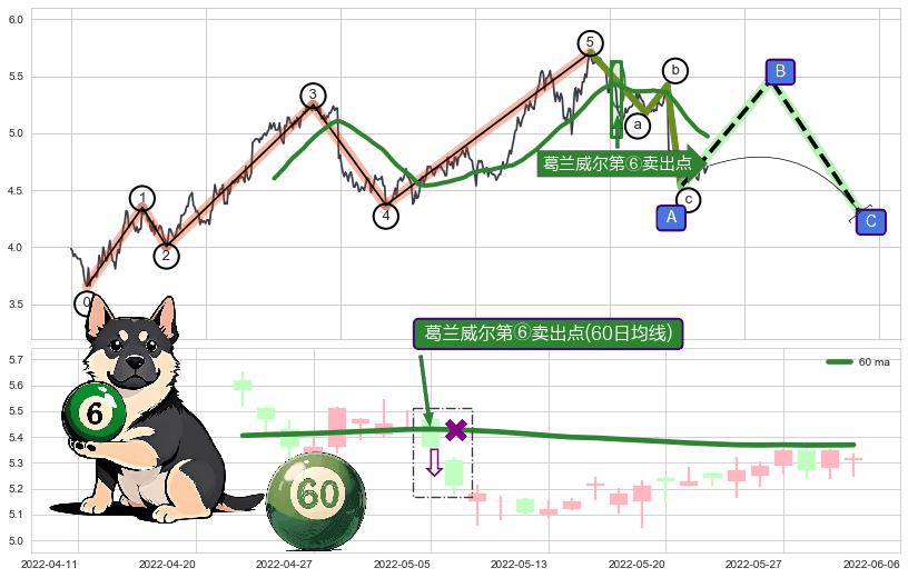 | 2 🅚:葛兰威尔第⑧卖出点 ➕ 🌊:波浪理论猜想上涨浪5已形成,猜想后续形成回调abc下跌(均值回复) ☞ 看空信号 ⇥ 【均线】交织【图形】⇥ 综合量化分数: 34 | > |