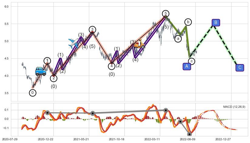 ➣ a,c调整浪MACD, RSI, KDJ走势都【未出现】背离,abc走势延续, 5浪反转概率增强