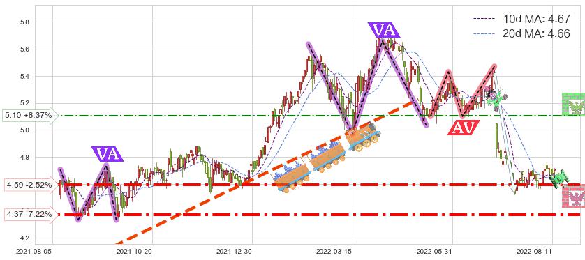 ♘ 阻力价格位5.10,可信任强度54.37%,距离最后交易2022-08-12形成的收盘价格4.71相差 +8.37%