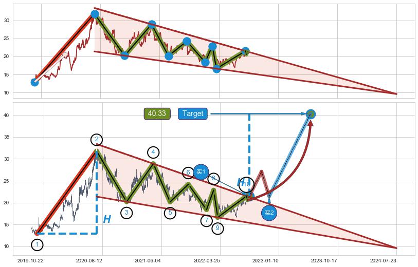 ➢ 最小中继整理涨幅→𝐇: 18.90 (𝐇楔型旗杆的长度:楔型起点→顶点)