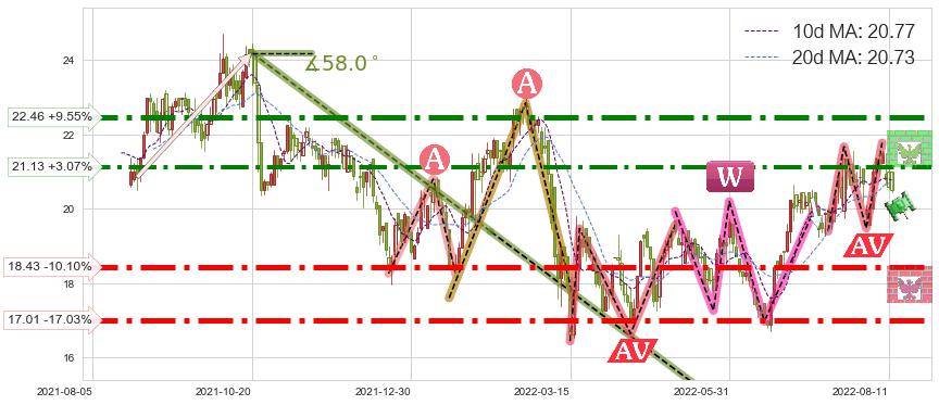 ♘ 阻力价格位21.13,可信任强度70.08%,距离最后交易2022-08-12形成的收盘价格20.50相差 +3.07%