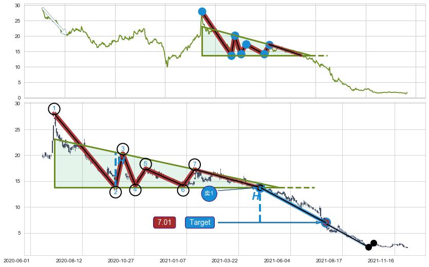 ➣ 最小中继整理跌幅→𝐇: 6.77 (下侧直角边第一支撑点②与斜边垂直距离)