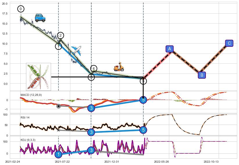 ➢ 1,3,5驱动浪MACD, RSI, KDJ走势都出现【常规背离】反转信号增强