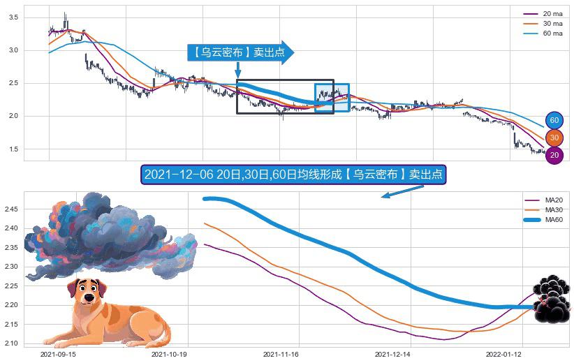 ⚀ 2021-10-22日-2022-01-18日显现 20日-30日-60日均线 【乌云密布】卖出点 看空信号,后市看跌,卖出