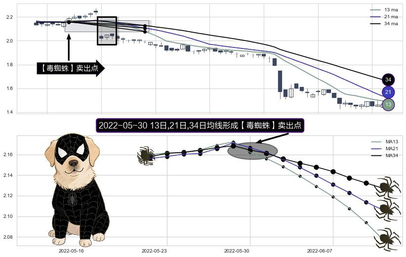 ⚀ 2022-05-30日显现 13日-21日-34日均线 【毒蜘蛛】卖出点 看空信号,后市看跌,卖出